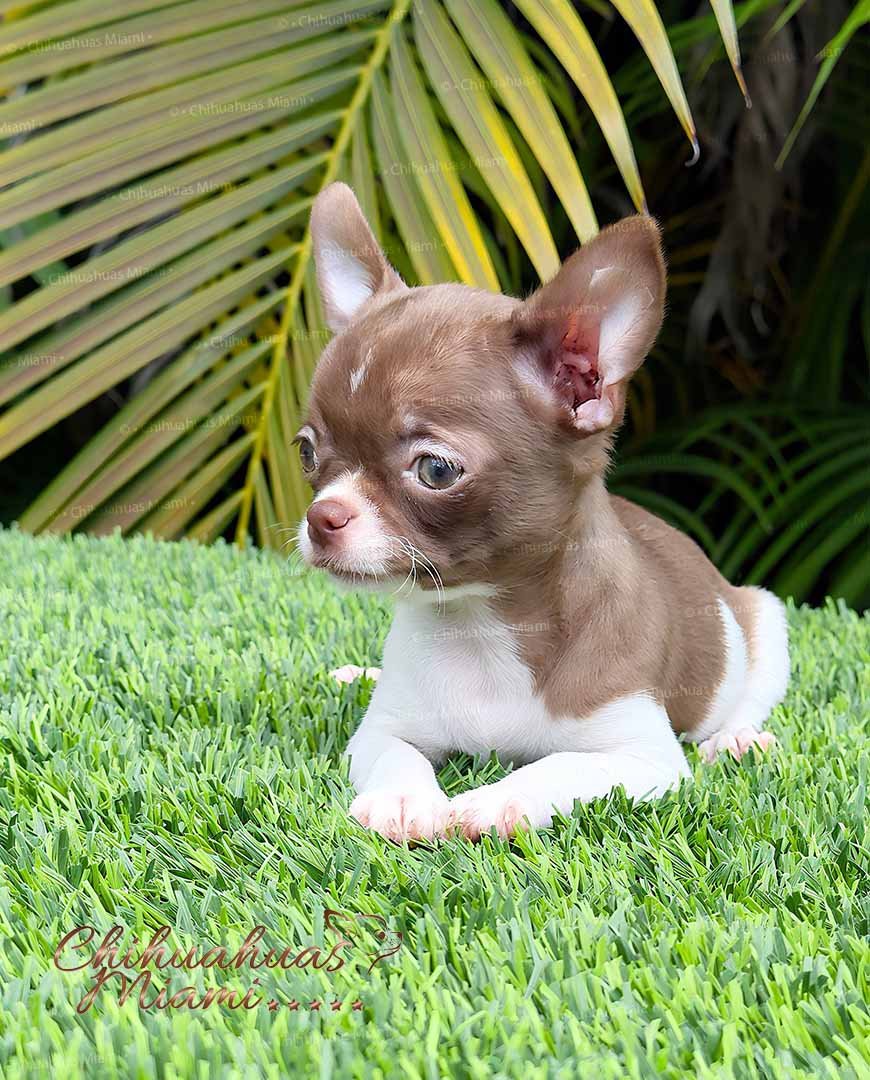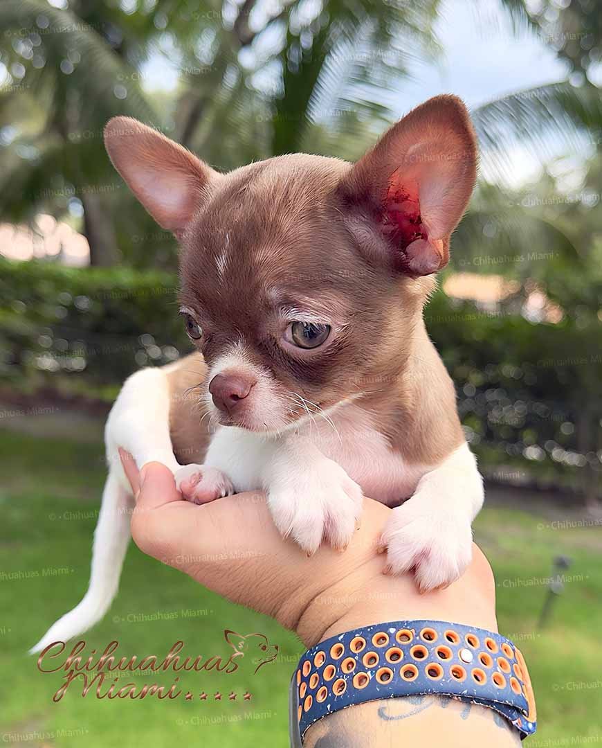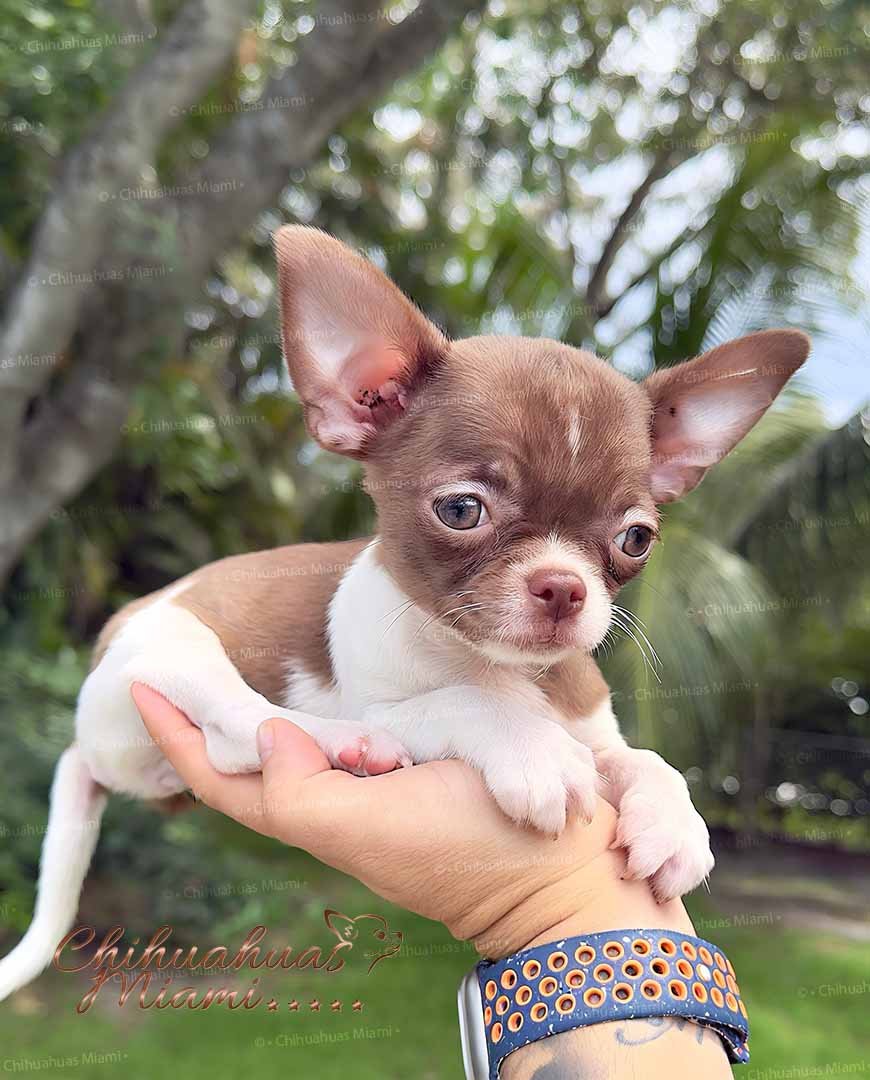 Aurora is an exotic little jewel delicate, exclusive, and full of charm. With her perfect apple head, expressive sapphire eyes, and very small size, she embodies everything that makes a Chihuahua so special. Sweet and affectionate, she loves being held and sharing her gentle nature with everyone around her.