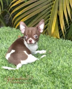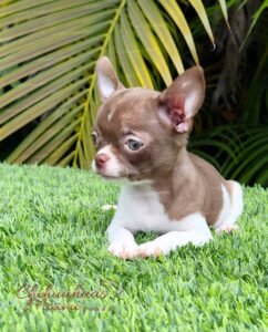 Aurora is an exotic little jewel delicate, exclusive, and full of charm. With her perfect apple head, expressive sapphire eyes, and very small size, she embodies everything that makes a Chihuahua so special. Sweet and affectionate, she loves being held and sharing her gentle nature with everyone around her.