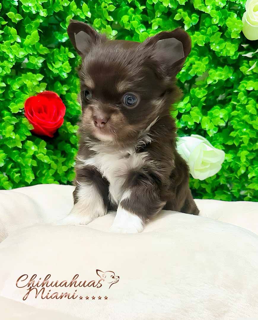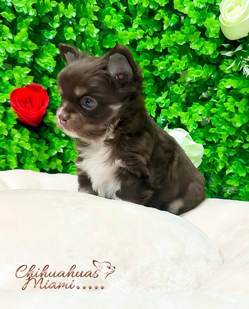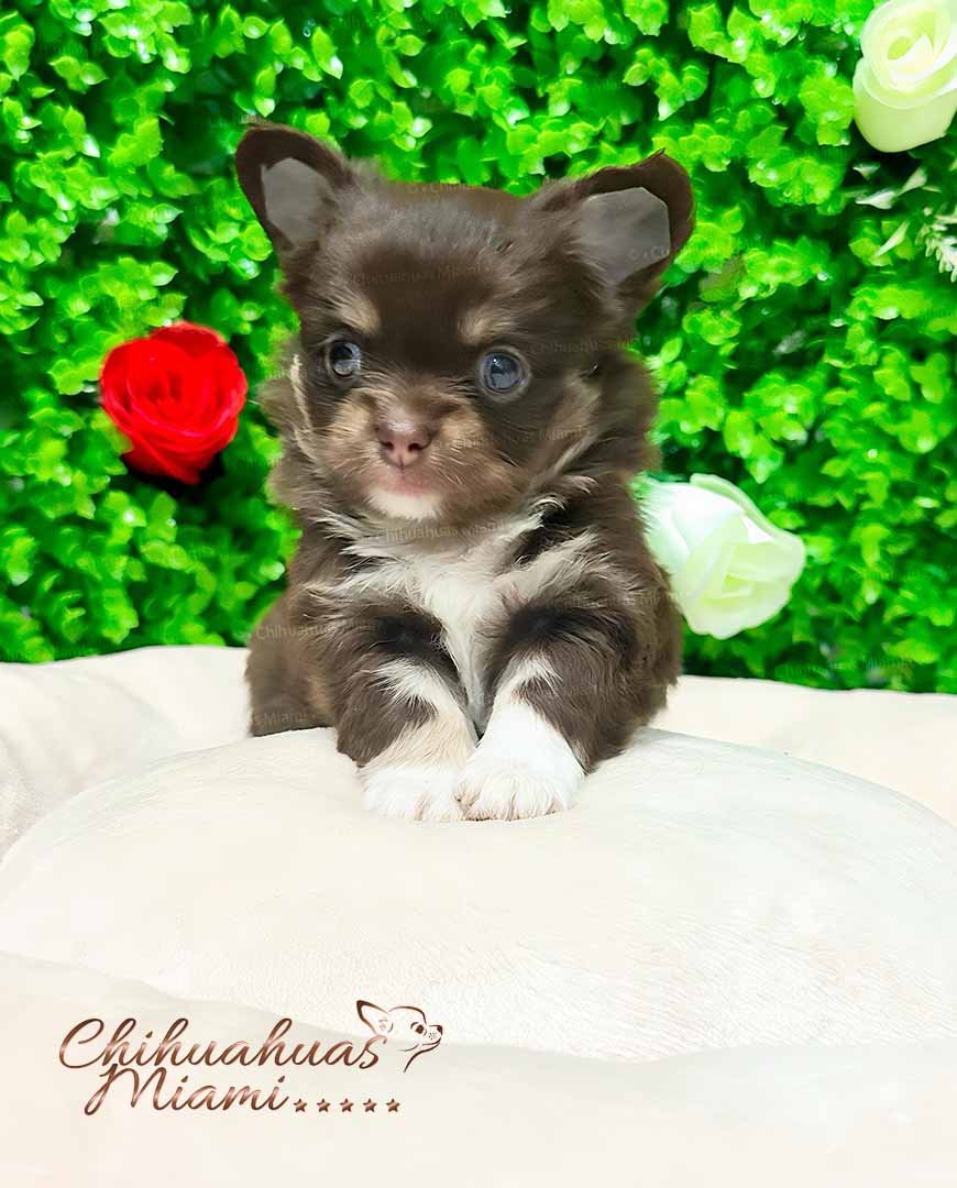 Bruno is an absolutely charming long haired Chihuahua boy with a soft chocolate coat and snow-white accents on his chest and little paws. His expressive eyes and apple head give him that classic Chihuahua elegance that makes him truly irresistible. He has a sweet personality, loves children, and is already pad trained, making him an ideal companion for a family. With his compact size and gentle nature, Milo is a wonderful choice for those looking for a tiny treasure to bring endless joy into their home.