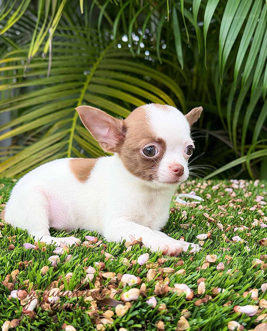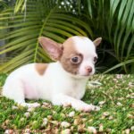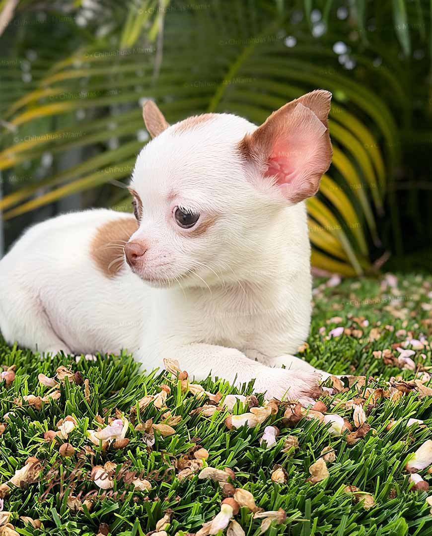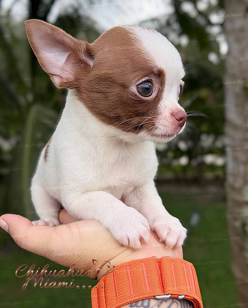 I’m a tiny short-haired chocolate & white Chihuahua girl, so small I can literally fit in the palm of your hand. I have big round eyes, a perfect apple-head profile, and a calm, loving personality that makes everyone melt the moment they hold me. I was born to be carried, cuddled, and adored.