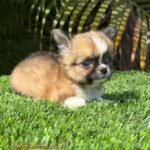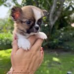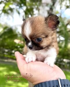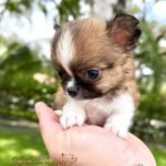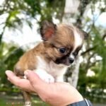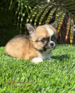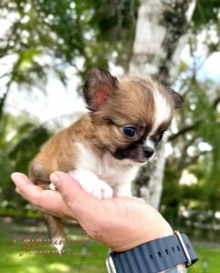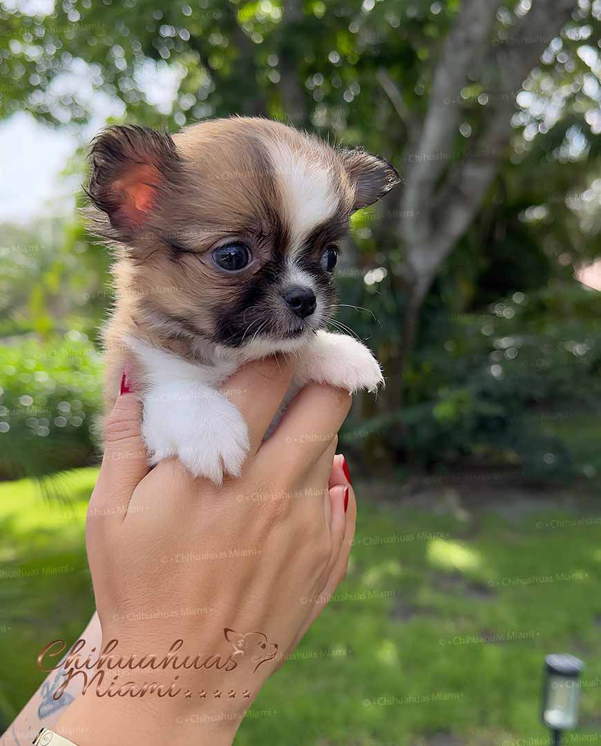 Lían is an exotic long haired teacup Chihuahua in a beautiful choco sable coat. He is so tiny he fits right in the palm of your hand. With an ultra short muzzle and a perfectly shaped apple head, he is truly one of a kind.