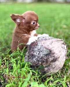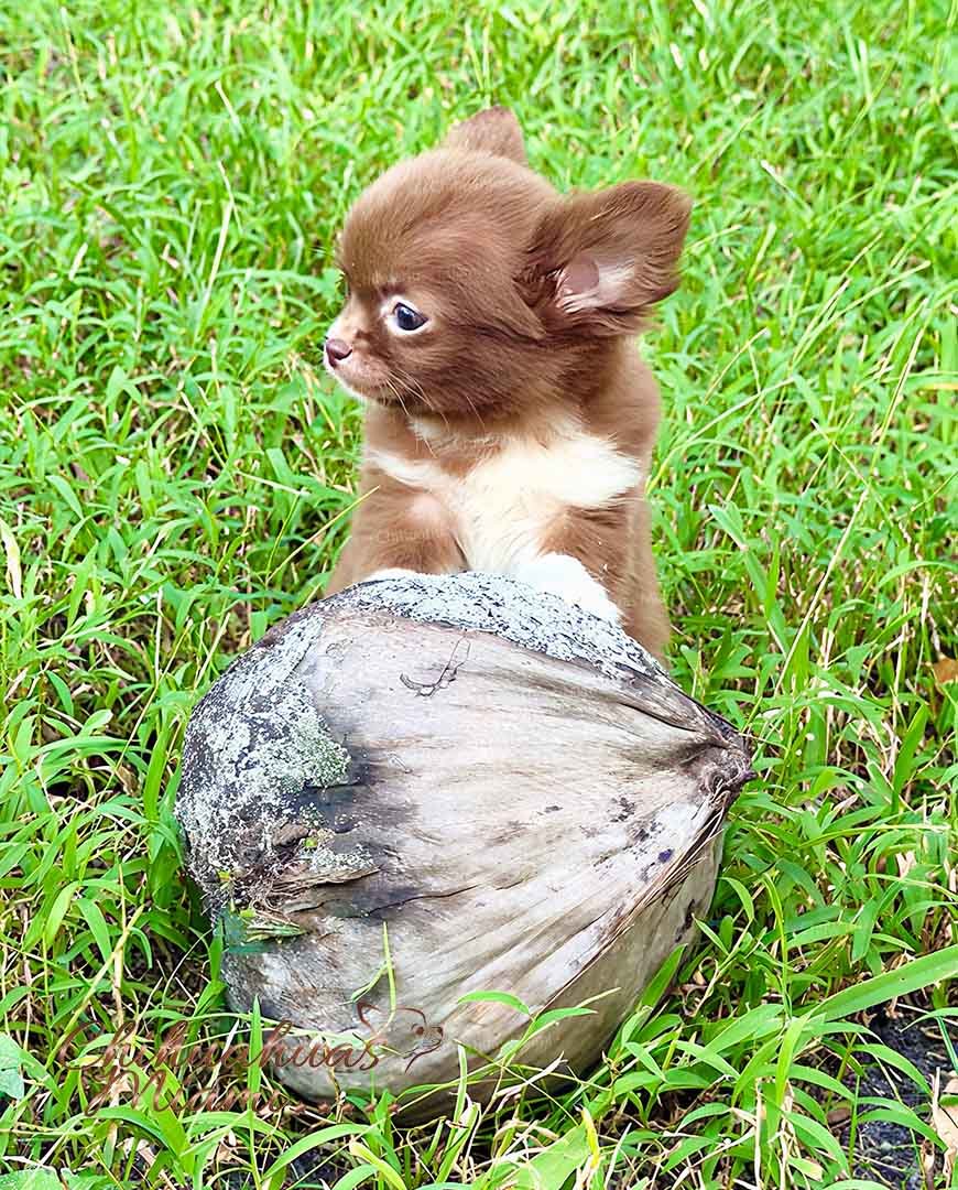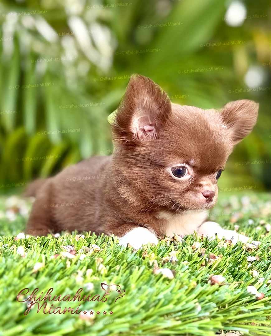 I’m an 11-week-old long haired chocolate Chihuahua baby girl. My apple head is perfectly shaped, my tiny ultra short muzzle makes me look like a little doll, and my big expressive eyes melt hearts wherever I go. I’m so sweet and playful that I spend the whole day wagging my tail, always looking for cuddles and love.