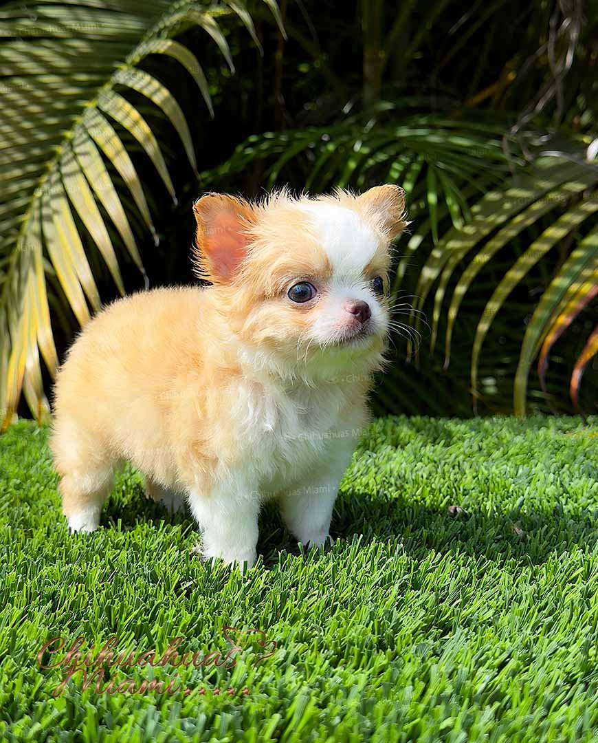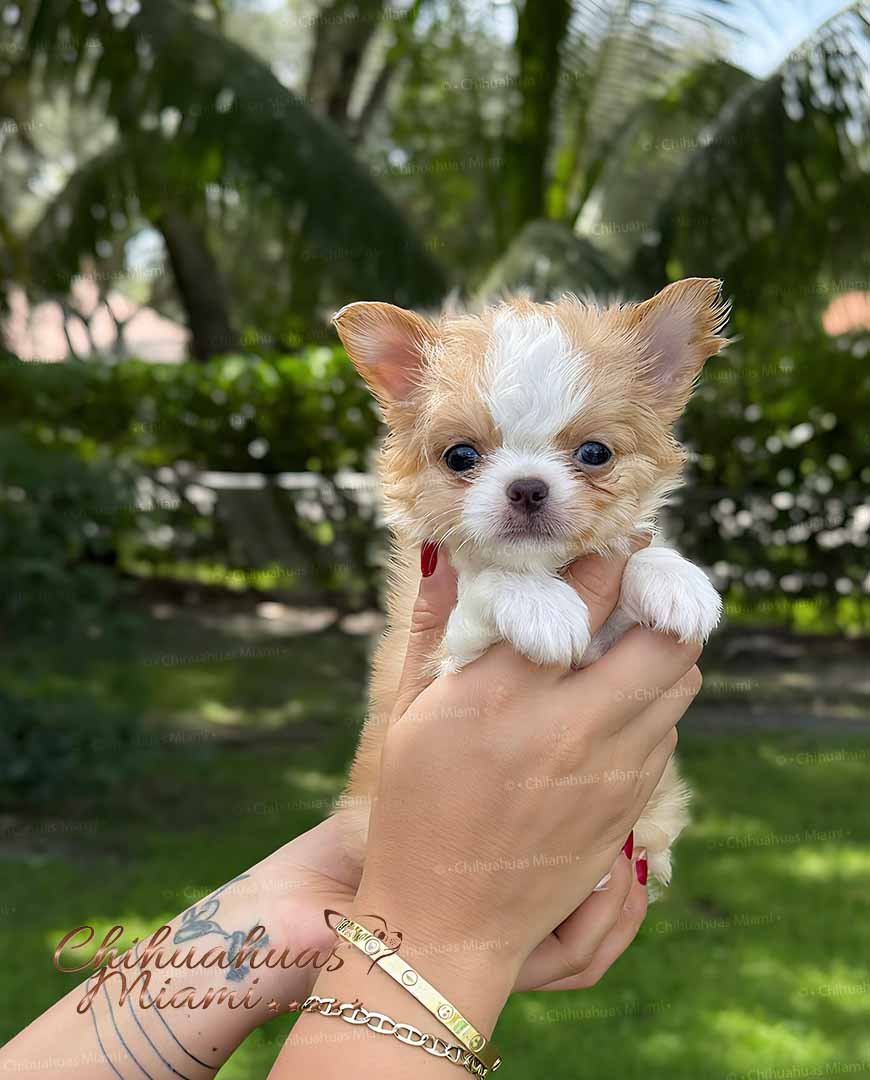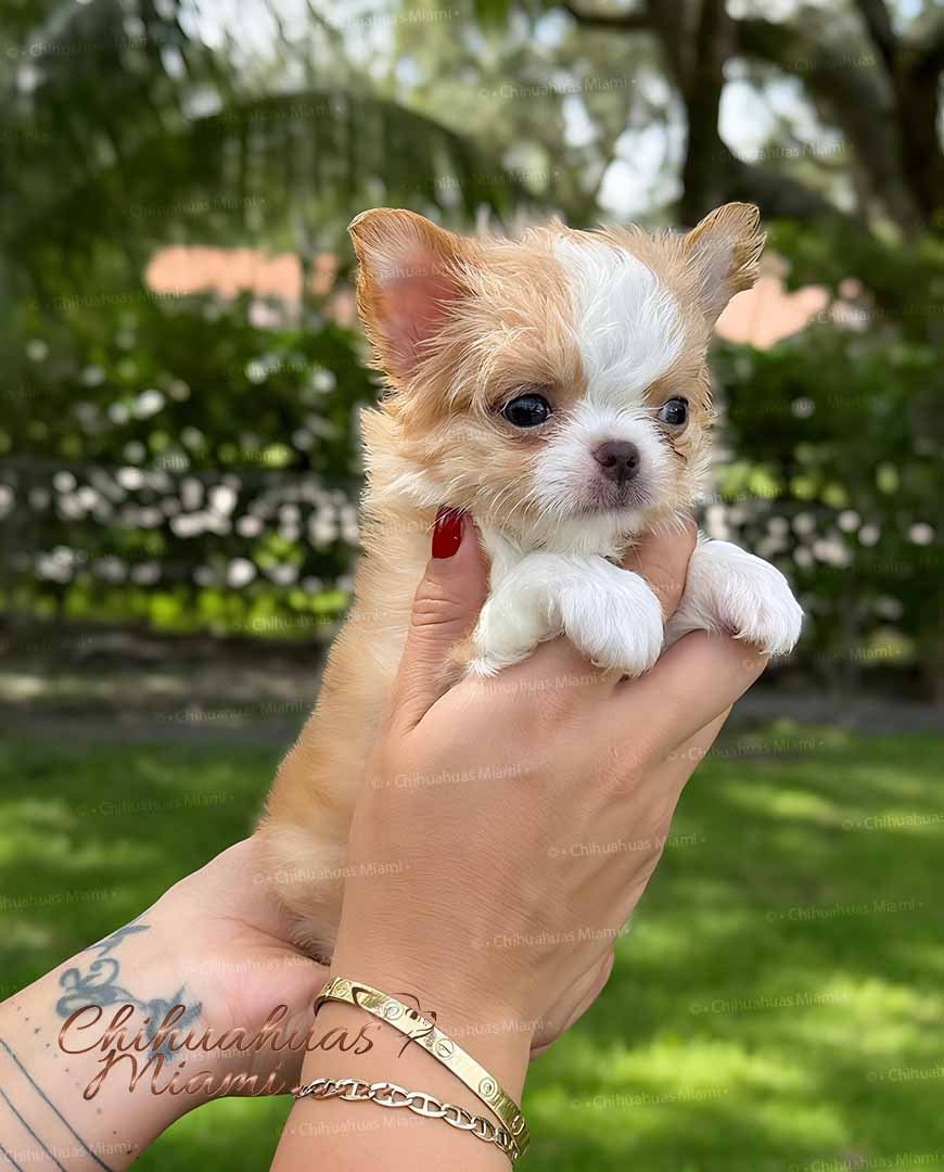 Exotic and rare long-haired Chihuahua male with an apple head and ultra-short muzzle. Now available! He will be delivered vaccinated, dewormed, microchipped, and with a Florida Department of Agriculture health certificate. Both parents are on site, and his quality is truly exceptional a one-of-a-kind companion you won’t find anywhere else.