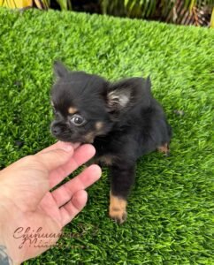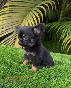 Princess Lia is a beautiful long haired Chihuahua in black and tan, so tiny she fits right in the palm of your hand. She has a short little muzzle, an adorable face, and is always wagging her tail with joy.