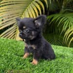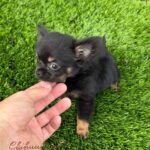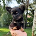 Princess Lia is a beautiful long haired Chihuahua in black and tan, so tiny she fits right in the palm of your hand. She has a short little muzzle, an adorable face, and is always wagging her tail with joy.